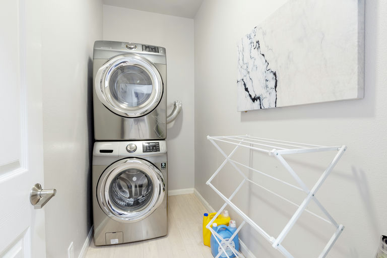 The home is designed with organization in mind, featuring a dedicated laundry room with neutral painting that adds a clean, stylish touch. This space comes equipped with a washer and dryer, as well as detergent and fabric softener for added convenience.