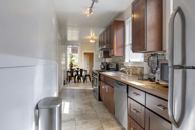 Additionally, thereās a four-seat table for meals and coffee breaks. The kitchen is well-equipped with plenty of wooden cabinets, stainless steel appliances, and a complete set of cookware and utensils. There is also a dishwasher available.