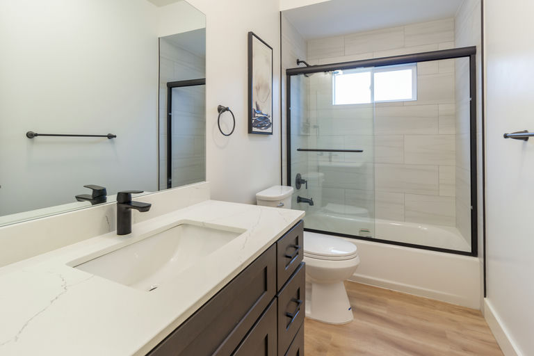 The shared bathroom features a sleek design with a large mirror, dark wood cabinetry, and light wood flooring. The bathtub has a glass sliding door with white tiled walls, offering a clean, modern look. A window above the tub provides natural light while ensuring privacy.