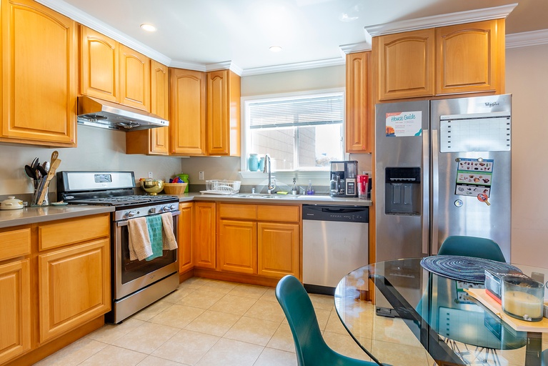 The kitchen offers ample space for meal preparation and is well-equipped with cookware and stainless steel appliances. There is also a four-seat dining table, ideal for enjoying meals and chatting with housemates.