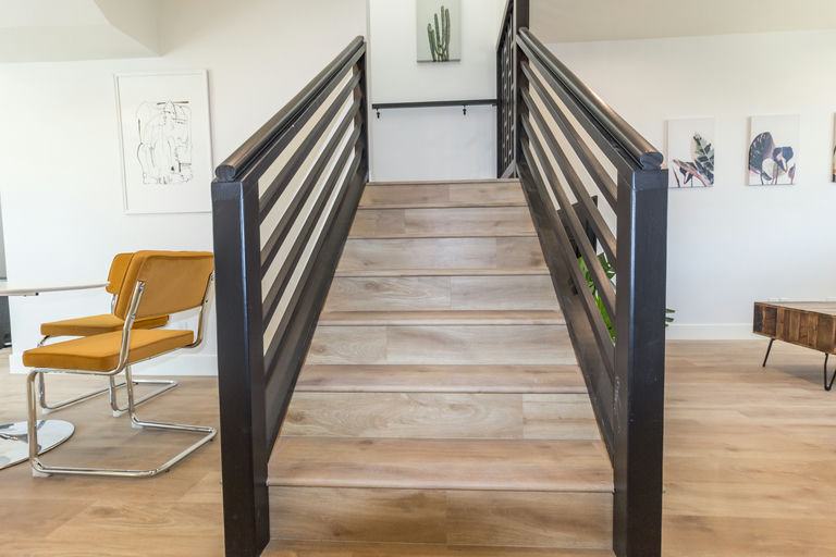 The open-concept living area is warm and inviting, furnished with a rust-colored sofa, sleek leather armchairs, and a flat-screen TV. Large windows flood the space with natural light, while hardwood floors, black metal stair railings, and leafy potted plants bring a cozy, modern aesthetic. Just off the living room, you’ll find a bright and functional kitchen complete with stainless steel appliances, white quartz countertops, a subway tile backsplash, and a spacious island with bar seating—perfect for casual meals or late-night chats.